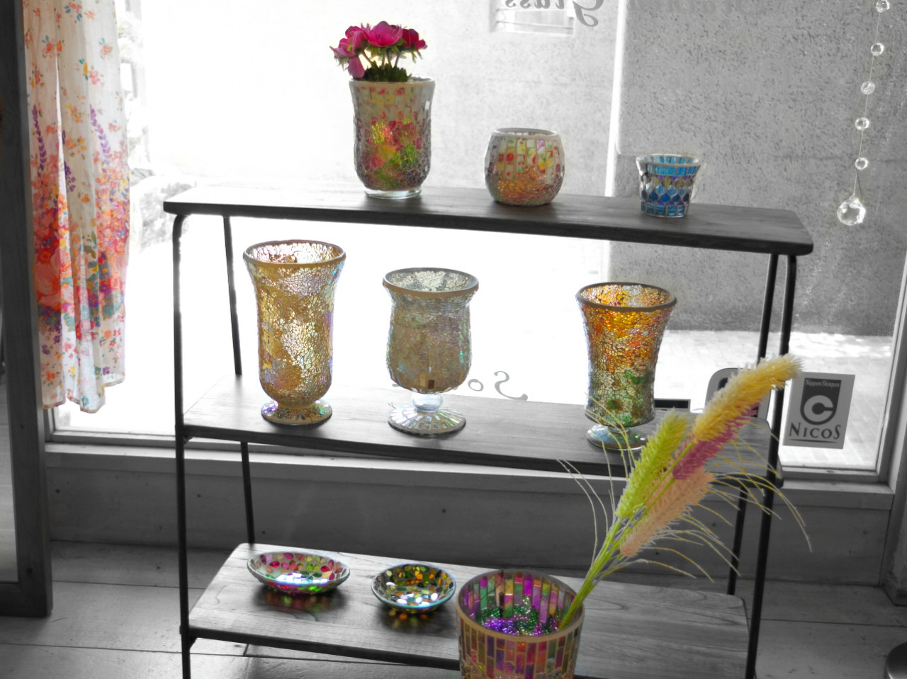 モザイクガラスという ちいさなガラスチップを沢山貼りあわせたフラワーベース